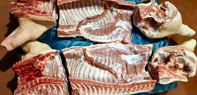 Carcass in 2 halves or each halve cut in 3 pieces