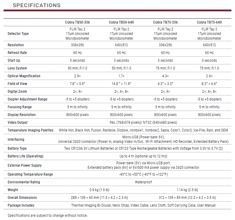 challenging environments. Based on the FLIR Tau 2 VOx microbolometer core, the Cobra offers a variety of image palettes: white hot/black hot/ Rainbow, etc. that can be easily adapted depending on different environmental conditions. This high-tech bi-ocular can take either two CR123A 3V Lithium Batteries or two CR123 rechargeable batteries, with voltage ranging from 3.0 V to 3.7 V. In addition, the external battery bank connected via standard micro-USB port provides an additional operating time. ■ ■ FLIR Tau 2 17μm pitch thermal sensor■ ■ Dual eye viewing system for comfortable, extended viewing sessions■ ■ Lightweight and robust design■ ■ Easy to operate device■ ■ Manually adjustable eyepiece and objective lens■ ■ Real-time display■ ■ Multiple color palettes■ ■ 2x, 4x, and 8x Digital Zoom■ ■ Waterproof■ ■ External Wi-Fi module (optional)■ ■ Integral MIL-STD-1913 rail on unit for optional accessories■ ■ Powered by two standard CR123A batteries■ ■ External power supply■ ■ Optional video recording■ ■ Tripod mountable■ ■ Limited 3-year warranty |